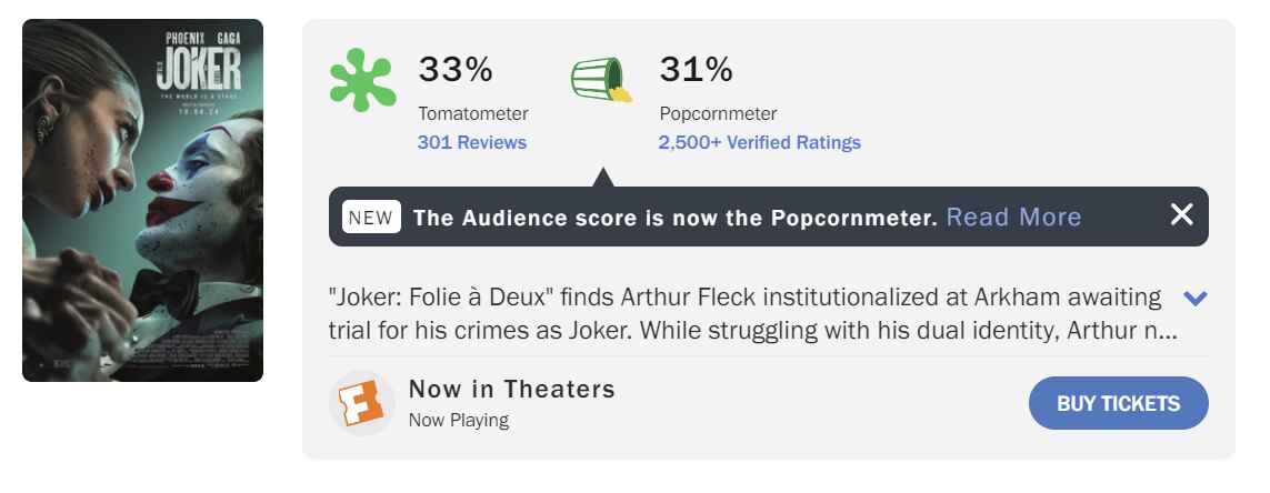 À l'inverse, Joker: Folie à Deux a coûté près de 200 millions de dollars auquel s’ajoutent environ 100 millions en coûts promotionnels, et ne pourra commencer à être rentable que s'il parvient à dépasser les 500 millions de dollars de recettes mondiales.