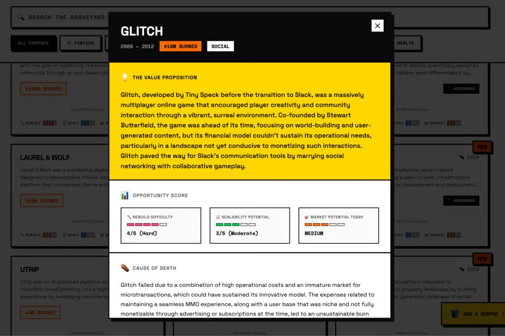 Le projet est né en 2026 de l’initiative d’un développeur connu sous le pseudonyme AnsbjergB. Son point de départ n’est pas une analyse macro-économique, mais une impasse personnelle : difficile de trouver un problème à résoudre quand on mène une vie stable, sans urgence particulière à corriger. Plutôt que de forcer l’inspiration, il choisit alors de regarder en arrière, vers les startups disparues malgré des financements parfois colossaux.