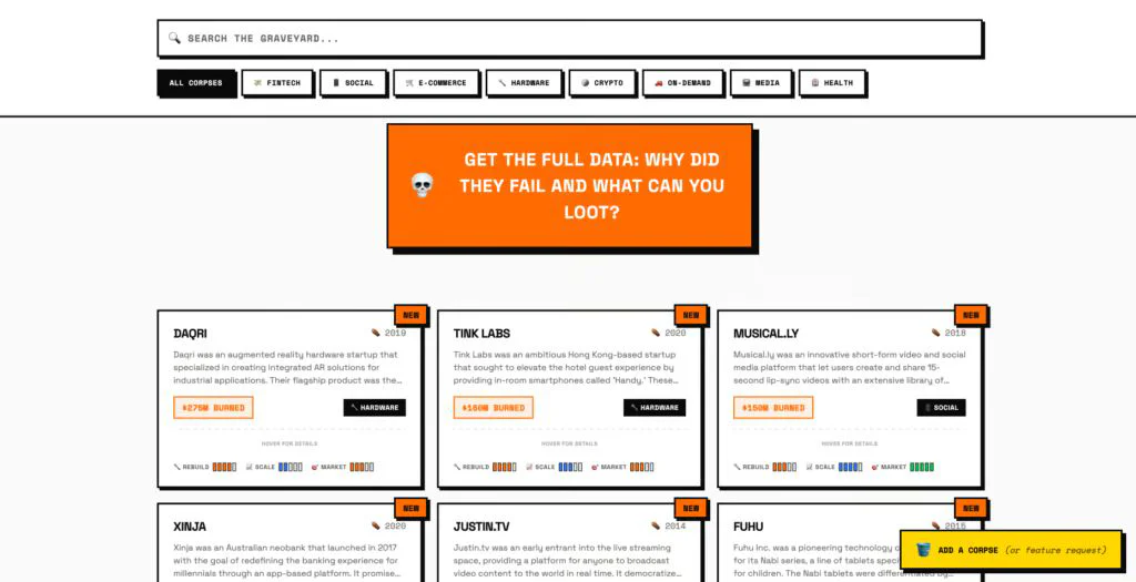 Le projet est né en 2026 de l’initiative d’un développeur connu sous le pseudonyme AnsbjergB. Son point de départ n’est pas une analyse macro-économique, mais une impasse personnelle : difficile de trouver un problème à résoudre quand on mène une vie stable, sans urgence particulière à corriger. Plutôt que de forcer l’inspiration, il choisit alors de regarder en arrière, vers les startups disparues malgré des financements parfois colossaux.